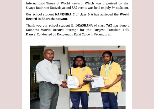 Thank you, our school student B. DKASHANA of class 7A2, has done a Guinness World Record attempt for the Largest Tamilian Folk Dance, conducted by Kongunadu Kalai Culoo in Perundurai.